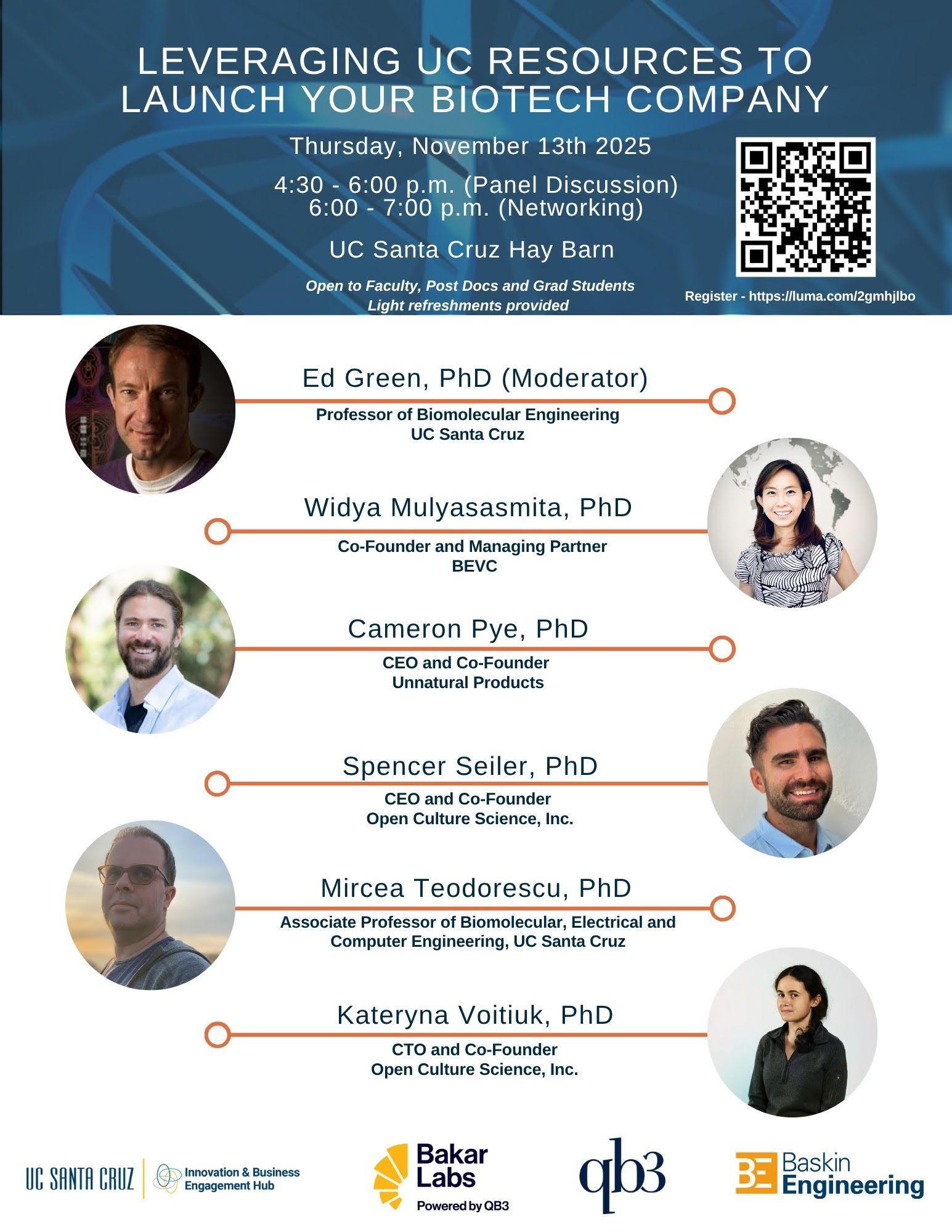To learn more, join us November 13 for a panel and networking event co-hosted by QB3-Central, QB3-UC Santa Cruz, Bakar Bio Labs, & the UC Santa Cruz Innovation & Business Engagement Hub!